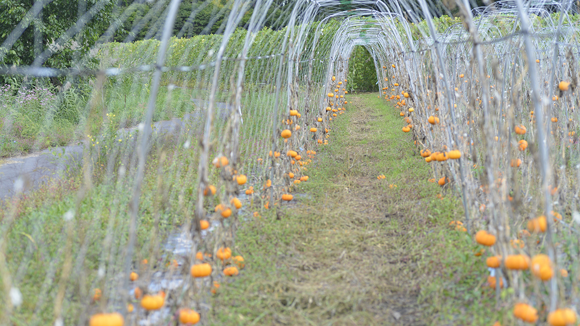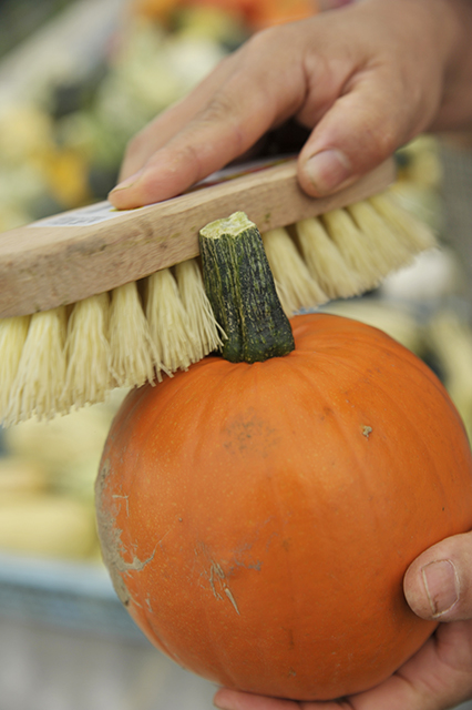 出荷前にはひとつひとつブラシで汚れを落とすという。「食べるんじゃなくて飾るんだから、綺麗じゃないとね」と農家さん。意外と手間のかかるカボチャさんなのだ。