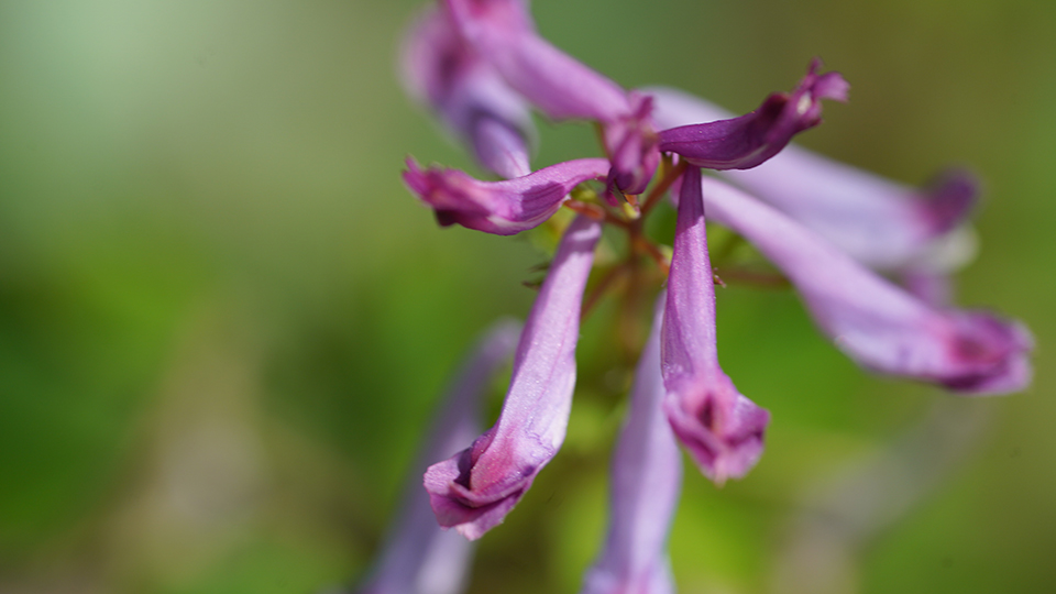 花手帖 ムラサキケマン 2026-04-13 ichiyo ムラサキケマン紫華鬘*Corydalis incisa ケシ科の越年草。花の形が、華鬘(けまん)という仏殿に吊るす仏具に似ていることが名前の由来。 湿気の多い場所を好む。河川の近く、山野のほか、道端でも自生している。茎が細くて、背丈は30~50cmくらい。 茎、葉っぱ、花には毒があるから注意。 花は、筒状で細長いので、蜂にとっては、蜜を吸うのが大変なのではないかと思うけれど、蜂が受粉を媒介。うまくできているのだ。