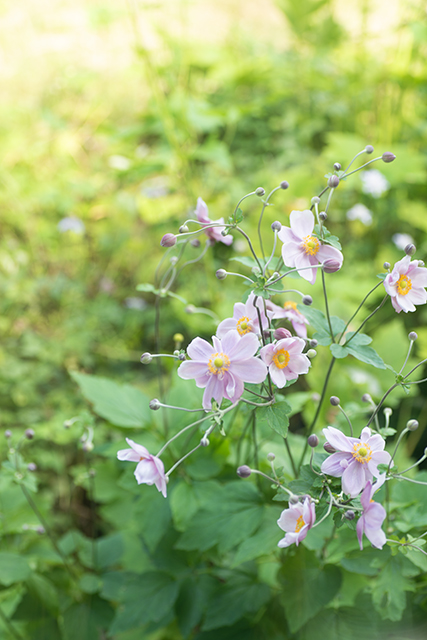 花手帖 シュウメイギク シュウメイギク(秋明菊) 学名:Anemone hupehensis キンポウゲ科の宿根草。秋に花が咲きます。細い枝は、案外しっかりと強く緩やかな曲線を描きながら育ちます。華奢なイメージがあるのですが、結構強く逞しいです。庭に植えておくと、毎年花を咲かせてくれます。 切花としても人気が高く、切花では枝はしっかり真っ直ぐしていることが多いです。 花の色も、白や濃いピンク、紫など、さまざまで、最近では八重咲き品種も人気があ流ようです。 私は、野に咲いている素朴な秋明菊が好きです。 お花の裏側も可愛いですよ
