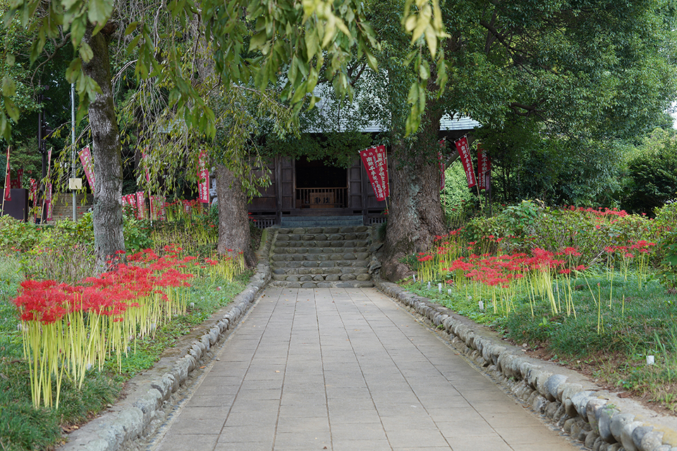 塩船観音寺は初めてです。迷うことなく駐車場に到着。午前九時半、車は一台も停まっていませんでした。一番乗り?定休日?不安になりながら境内へと足を踏み入れると、茅葺き屋根のお堂が見えて、その風情にテンションが上がりました。足元には、まだらに彼岸花が咲いていました。