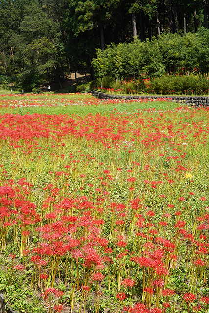 木のベンチに腰を下ろし、しばらく赤い絨毯を眺めた。遠くに一人カメラを構える男性の姿が見えた。静かな空間だ。虫の声を聞きながら大きく深呼吸し、花を愛でる静かな時間を堪能。