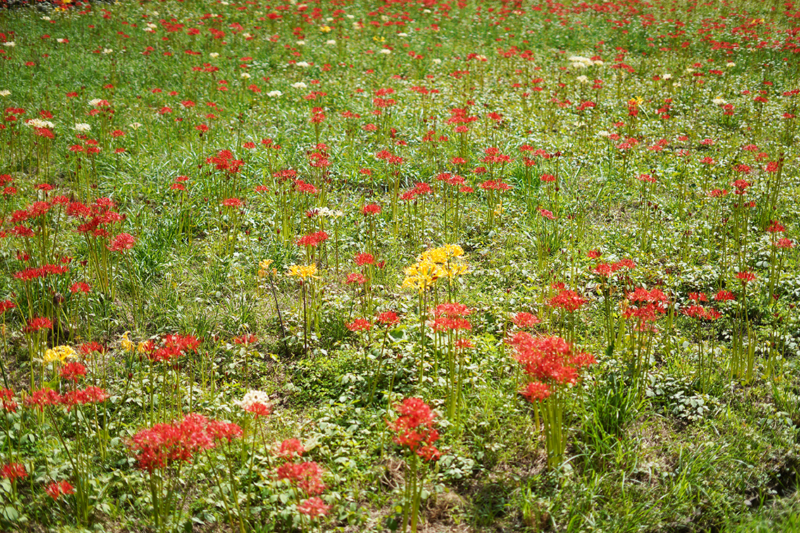 ようやく彼岸花エリアに到着。手前には黄色や白の彼岸花が混じっていました。ポップな感じ。その可愛らしさに思わず足を止めた。その先に広がるのは、赤の世界。太陽を浴びた花弁はラメを散りばめたように輝き、緑の地面に浮かび上がる。写真で見るのと太陽の下で実際に見るのとは大違い。