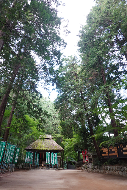 木々に囲まれた参道は、山道のようでちょっとしたハイキング。スニーカーで来てよかった。車椅子の母は連れて来れなかったなあと思いながら歩き進むと、看板発見。