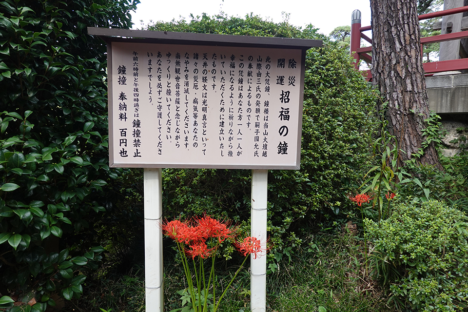 歩き進むと、「招福の鐘」があります。鐘撞 奉納料100円とありましたので、ちょいと突かせてもらいました。(午後4時から午前6時までは鐘撞禁止です)あまり大きく撞くと迷惑かしらとも思いましたが、ここはせっかくなので、力を入れて撞かせていただきましたよ。
