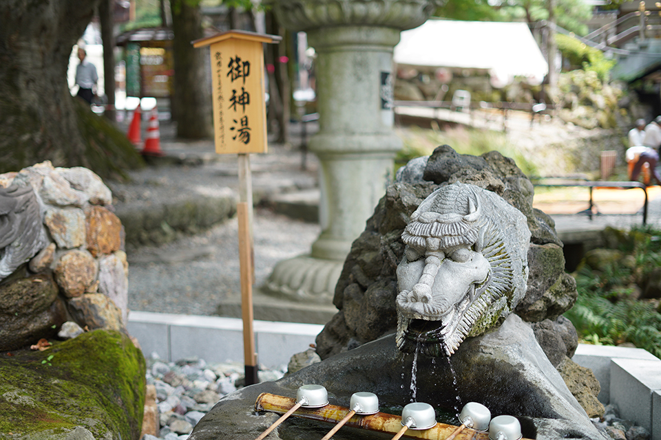社殿に向かう前に、龍の口から流れる「御神湯」(ごしんゆ)を発見。手を清めたらお湯だったからびっくり。看板に「飲用できません。熱いので気をつけてください」と書いてありました。なんで熱いの?手水舎がお湯なのは初体験。調べてみると、龍の口から流れているのは、「長寿湯」といわれる天然温泉。竜神伝説にちなんで龍の口をかたどっているのだそうです。これだけでもご利益ありそうですね。
