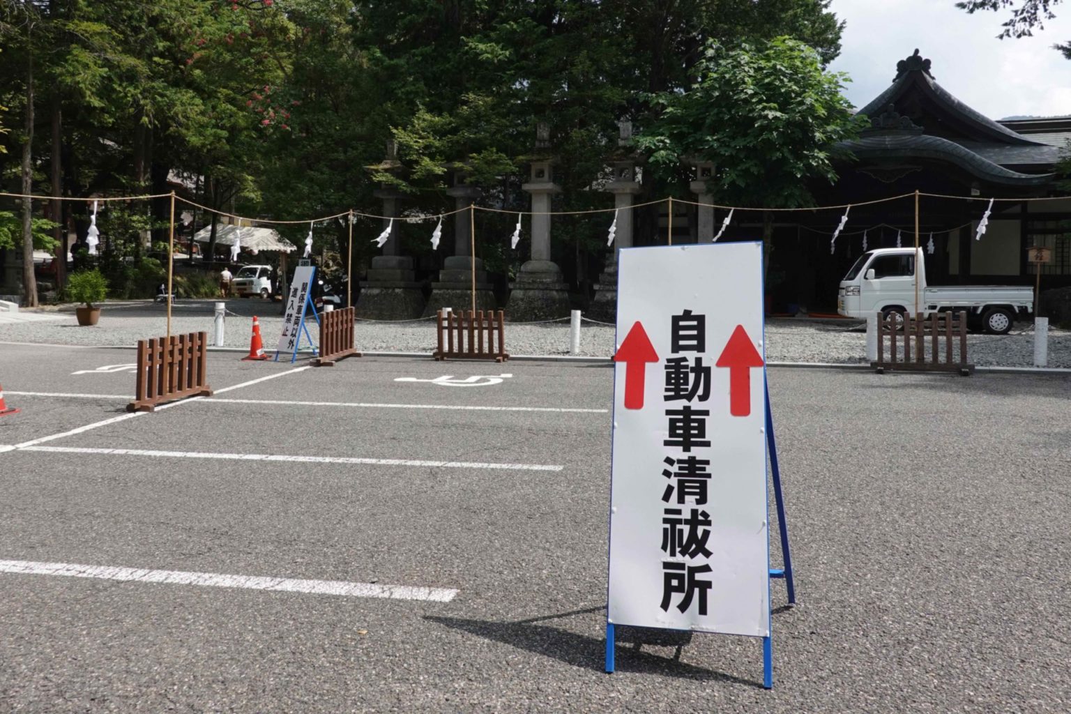裏から歩いて境内へ。最初に目に入ったのは「車のお祓いはこちら」という看板。当たり前のことなのですが、ああ、車のお祓いもしていて地元の人にとっては生活に密着した存在なんだなあと実感。