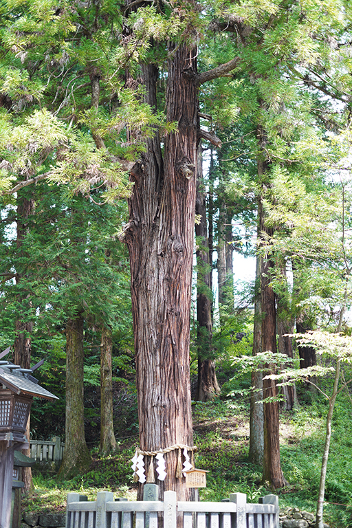 この杉は、先で二又に分かれているのだけど、根本はひとつになっていることから「縁結びの杉」といわれています。写真でわかりますか?上の方が二又に分かれています。