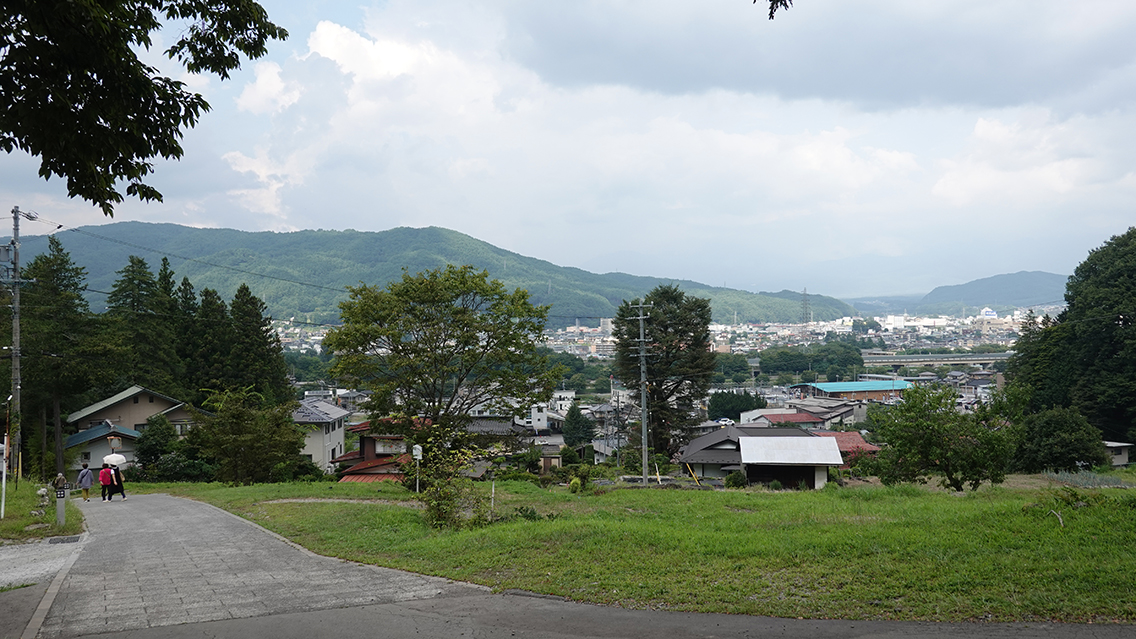 秋宮・春宮とは雰囲気が大きく異なり、素朴で自然と一体化した境内が広がります。古代の祭祀を思わせるような空気が漂い、時がゆっくりと流れているかのようです。振り返ると、遠くに町が見えました。ちょっと坂が続くので、車椅子の母は連れてこれないなあと思いながら歩きました。